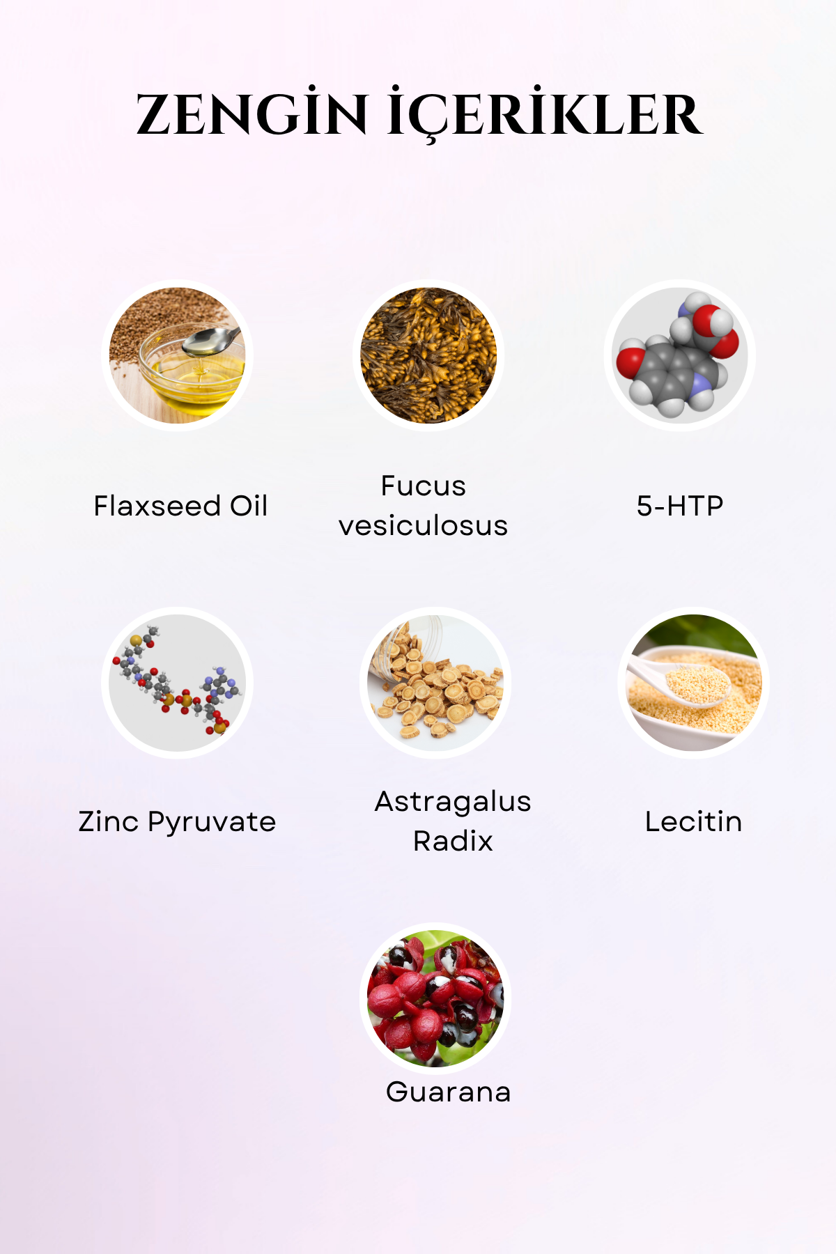 BANT İÇERİĞİ: Astragalus Radix, Guarana, Focus Vesiculosus, 5-HTP, Çinko Pirüvat, Keten Tohumu Yağı, Lecitin.