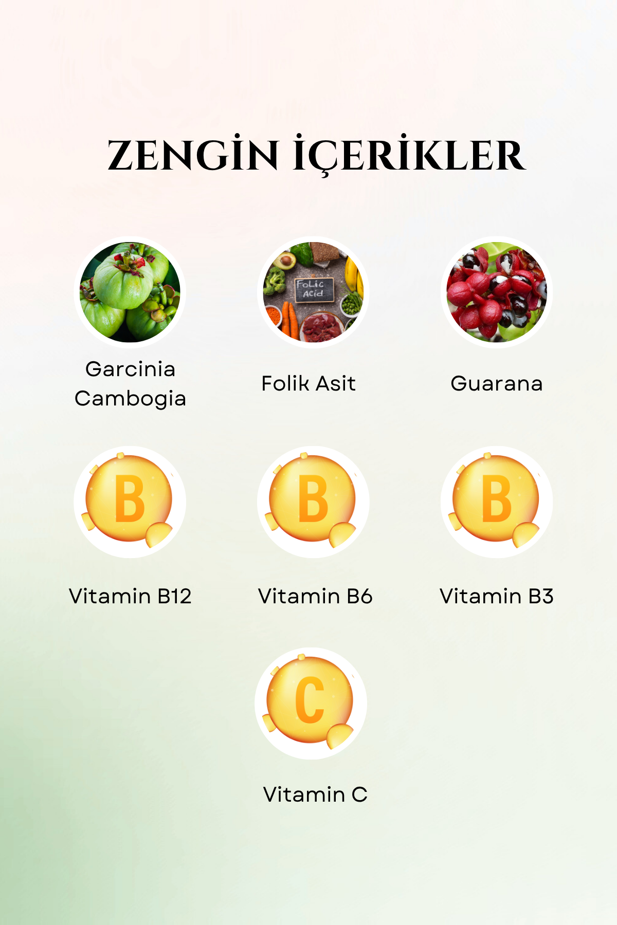 BANT İÇERİĞİ : Garcinia Cambogıa, Vitamin B12, Vitamin B6, Vitamin B3, Vitamin C, Folik Asit, Guarana.